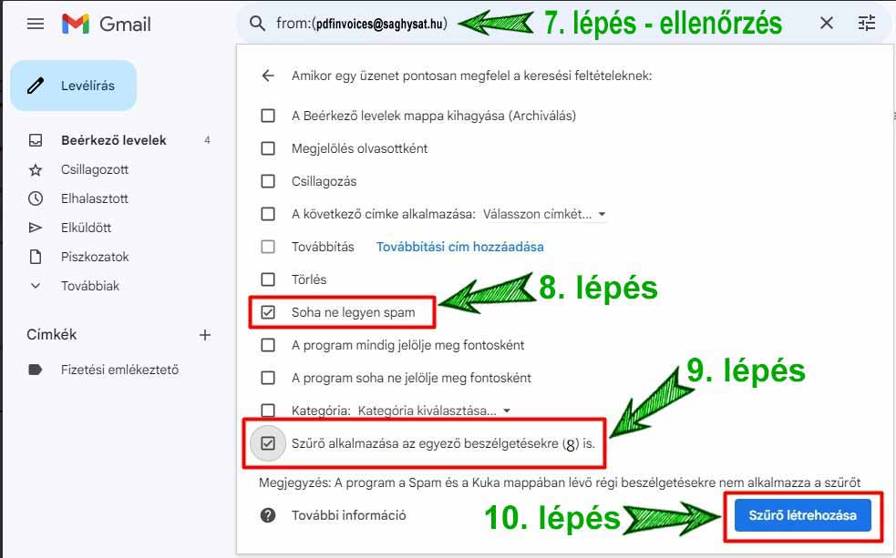 5. lépés, írja be a feladóhoz a pdfinvoices@saghysat.hu email címet, majd kattintson a 6. lépésben megjelölt "Szűrő létrehozása" gombra.